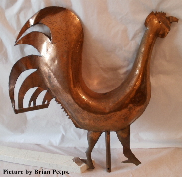 Left. This is the actual "Copper Cockerel" that was last awarded to the sloop "Saxby" in the very last Barton Waterman's Regatta which took place on August 3rd 1929. The cockerel is owned by the Humber Keel and Sloop Preservation Society and is presently kept at the Barton Museum in Baysgarth Park. The society also has the pennant flown by the committee boat from that last race in which thirteen sloops took part having to contend with a gale on the return leg. The listed finishing sloops were - Iron vessels; 1. Saxby, 2. Zenitha, 3. Alva S, 4. Swinefleet, 5. Salvager, 6. The Humber (Humber T.) Wooden vessels; 1. Faxfleet, 2. Burgate, 3. Alice, 4. Lilian and May, 5. Thistle, 6. Spider T. Why Spider T is listed with the wooden sloops is unclear, she is definitely a steel vessel. (Steel built ships were still referred to as "Iron") No doubt a journalistic error. Click on www.keelsandsloops.org.uk to visit the HKSPS web site. |